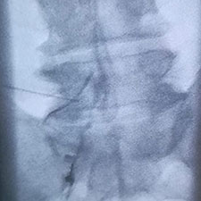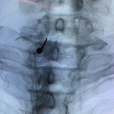 La figura muestra la aguja en el ganglio dorsal de la raíz de L5 izquierda, y el contraste inferior dibuja la raíz de S1 izquierda.
